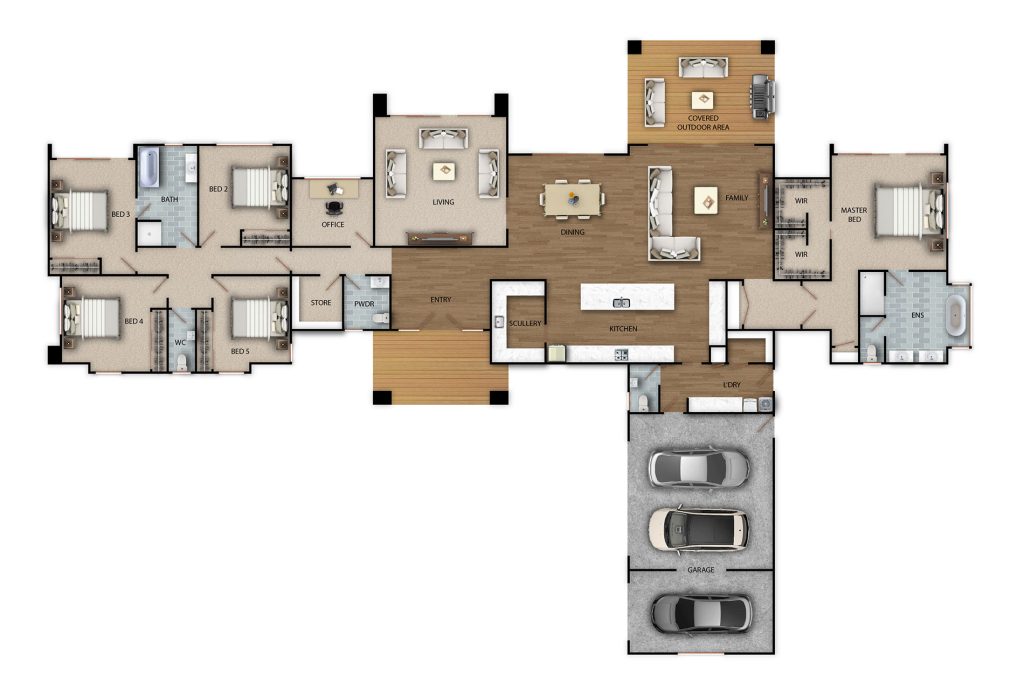 The Wanaka 318 takes our popular Wanaka layout and gives it more breathing room — with generous open-plan living, a gourmet kitchen, and multiple lounge spaces for entertaining or relaxing. Four spacious bedrooms, a separate media room, and seamless indoor–outdoor flow make it the perfect choice for growing families or those who love to host in style.